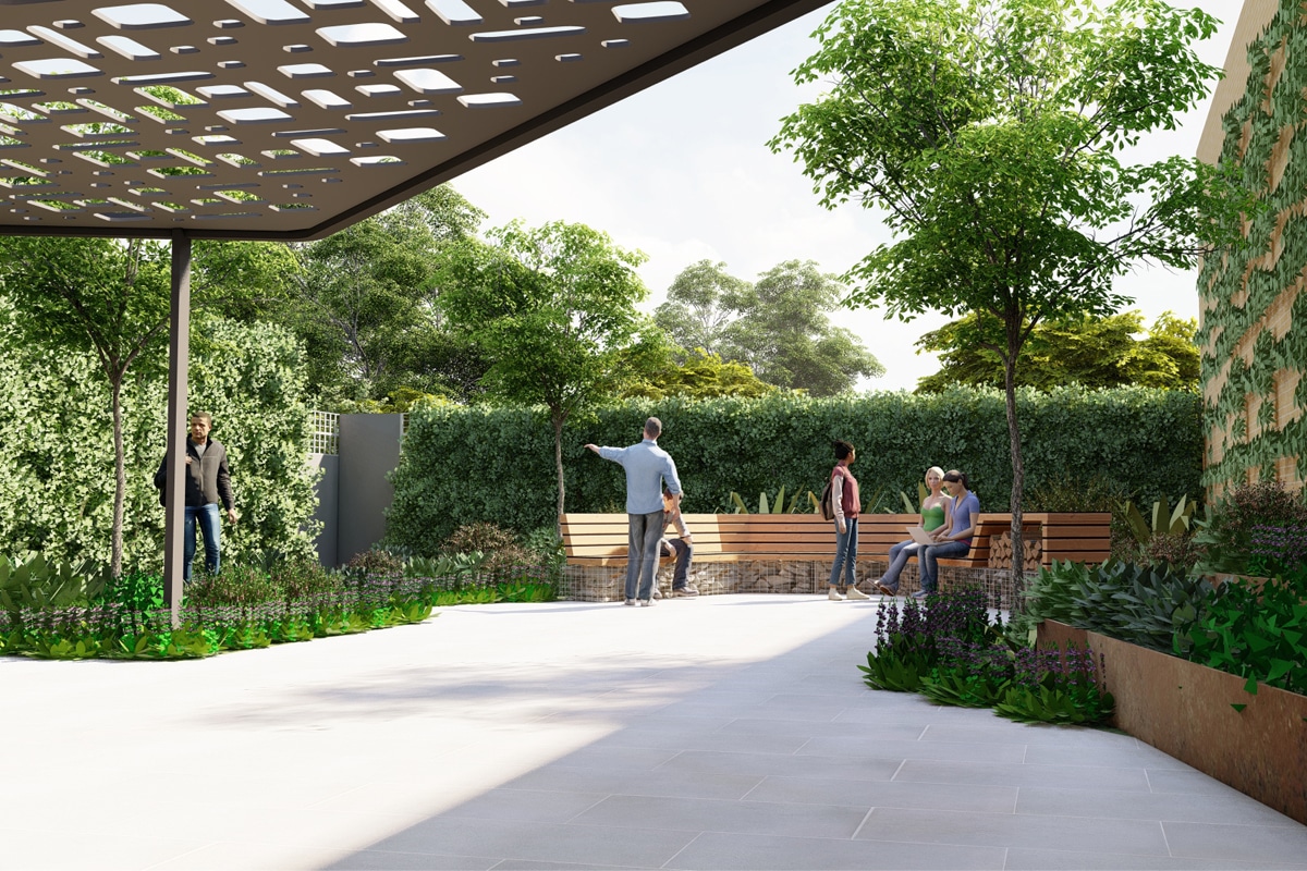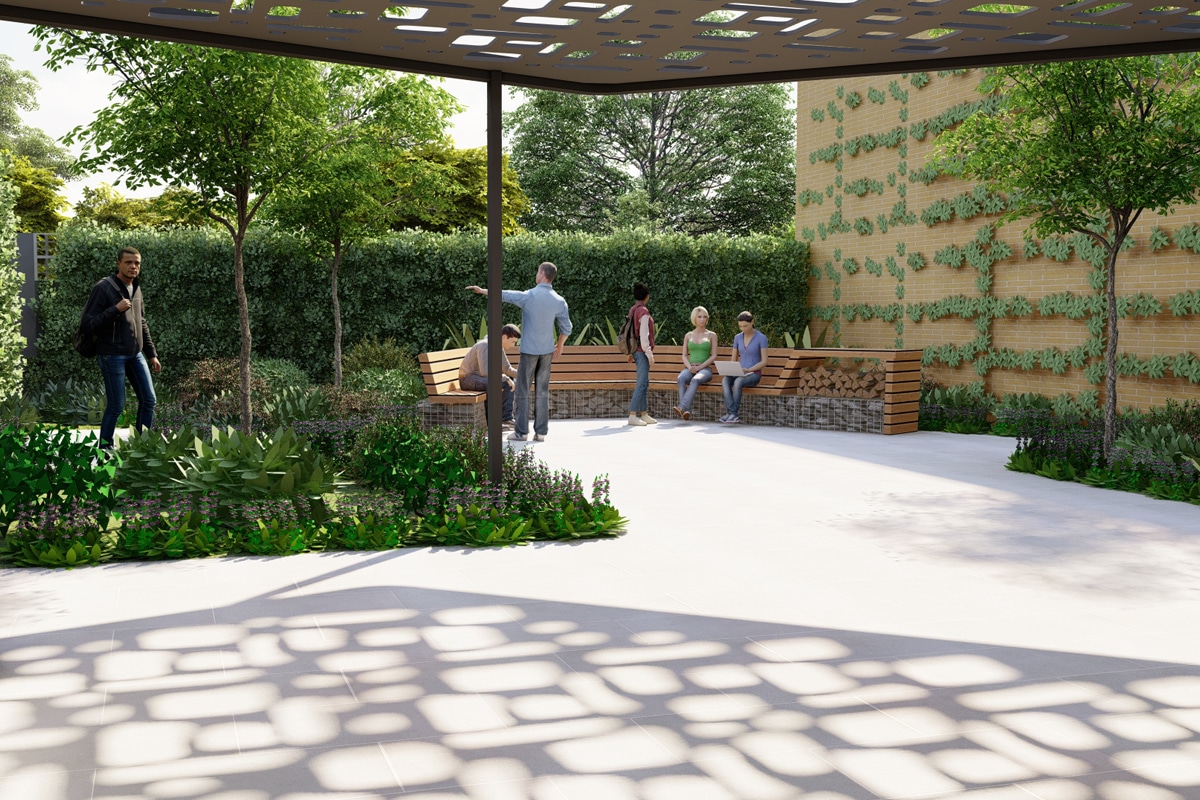 A formal shade structure was designed to complement the building and this was supported by feature deciduous trees, offering year-round interest. Shade in summer and that well needed winter sun. Mass seasonal planting and raised production beds create a sense of calm and the inclusion of an extensive seating structure allows for those group gatherings.