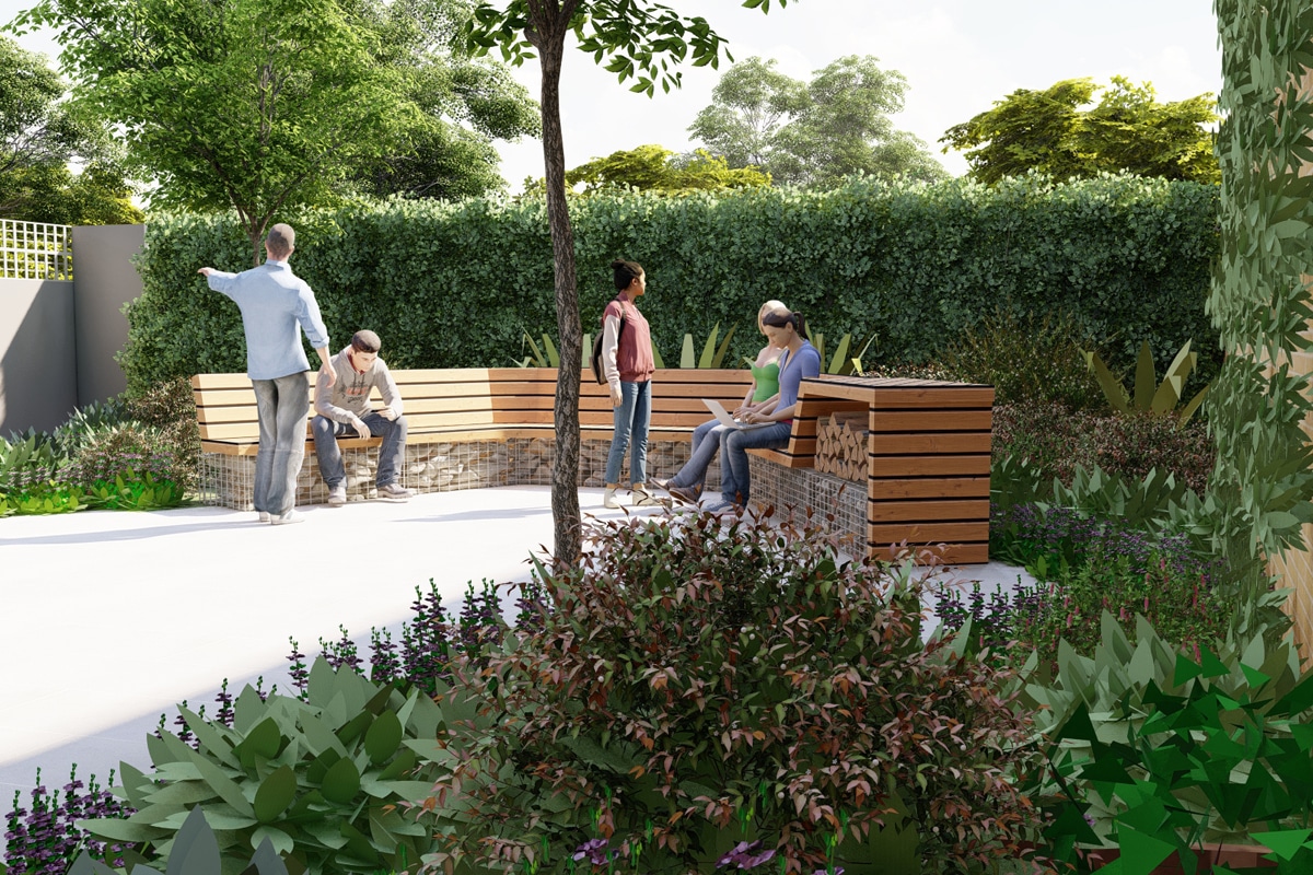 The proposed location was confirmed for the garden after undertaking our site analysis, and due to its ideal location within easy access to catering facilities and college amenities the existing courtyard garden was reconfirmed. As the garden needed to support the ebb and flow of a wide range of visitor numbers, we created a level paved area with a graded access pathway.