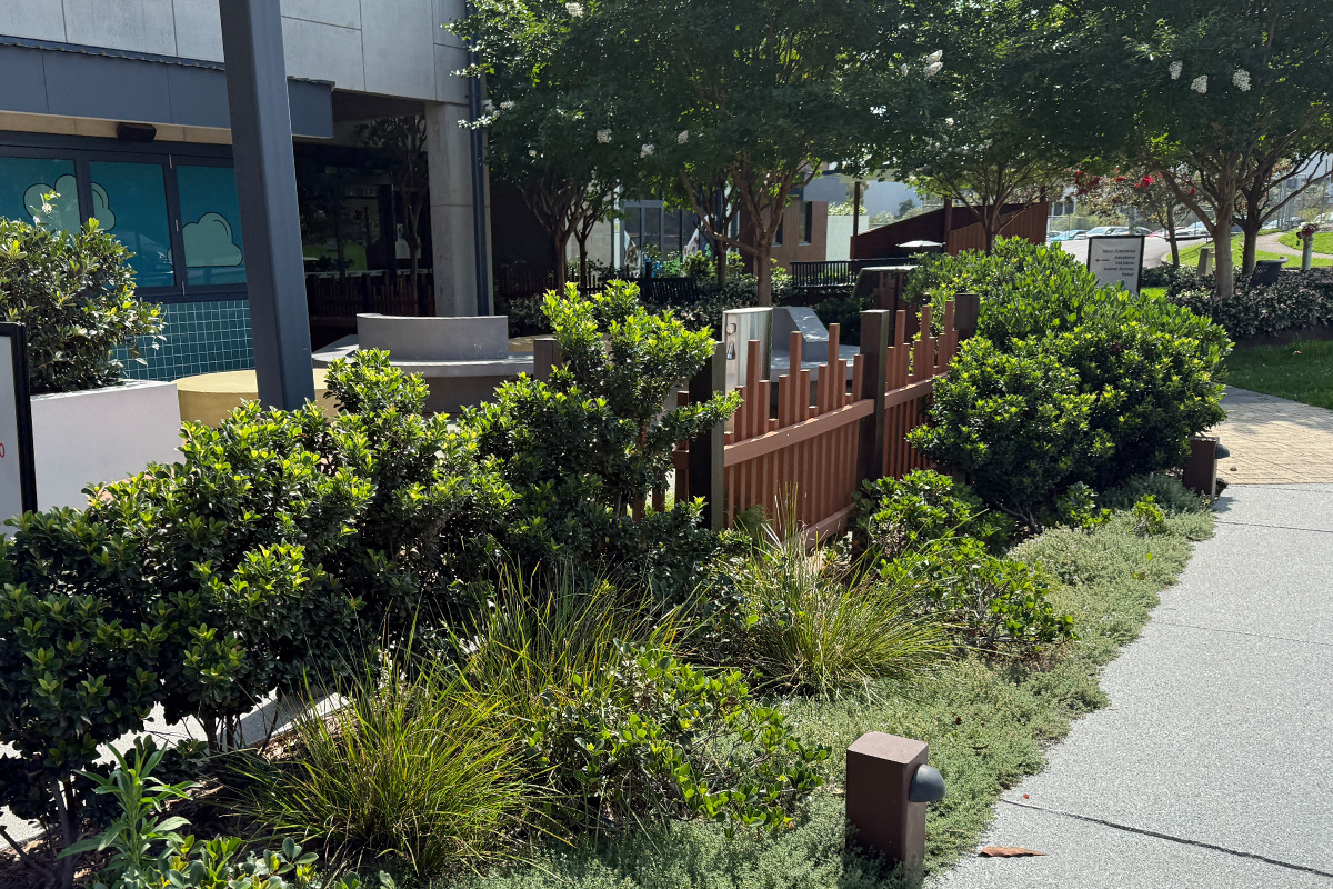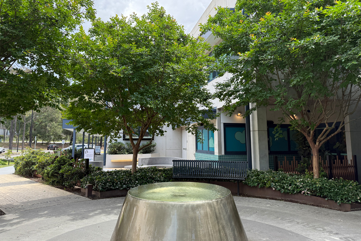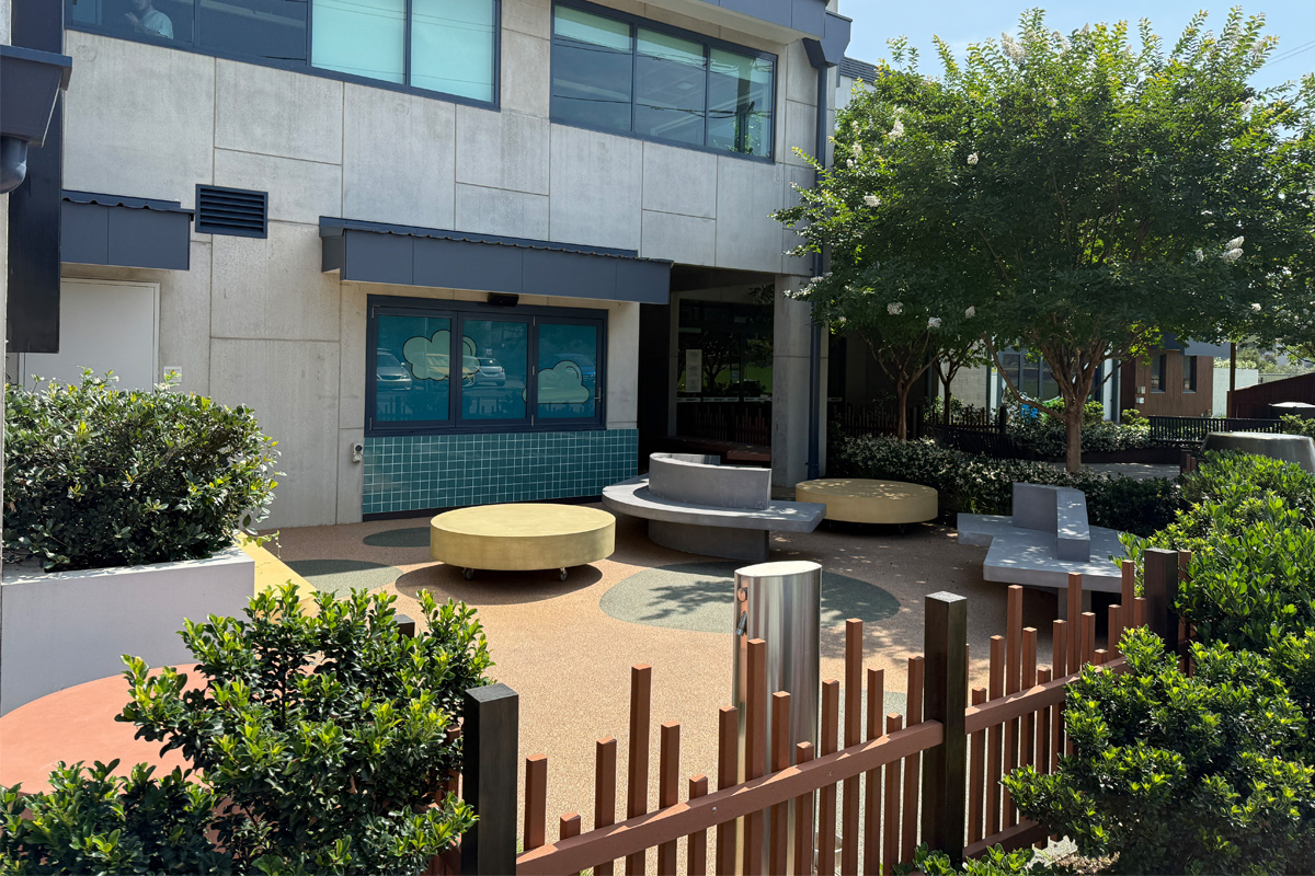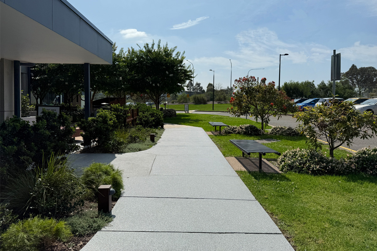 A feature avenue of Corymbia ‘Summer Red’ Eucalypt trees create a welcome from the carpark and guide visitors towards the main entrance, whilst scented mass planting and external seating under the shade provide time out for training participants or visitors and staff just wanted to take time out from the busy day.